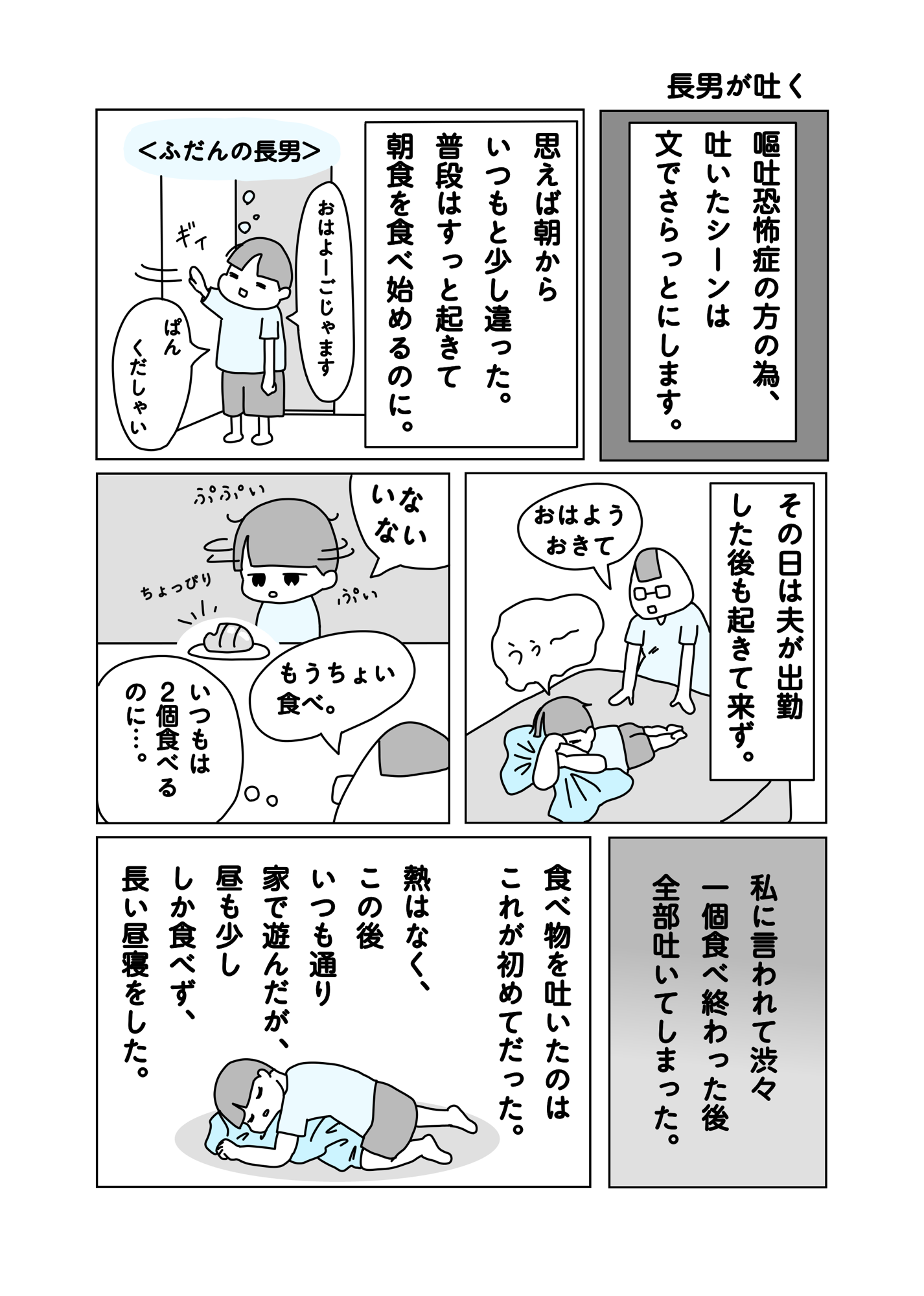 嘔吐恐怖症の方の為、吐いたシーンは文でさらっとにします。