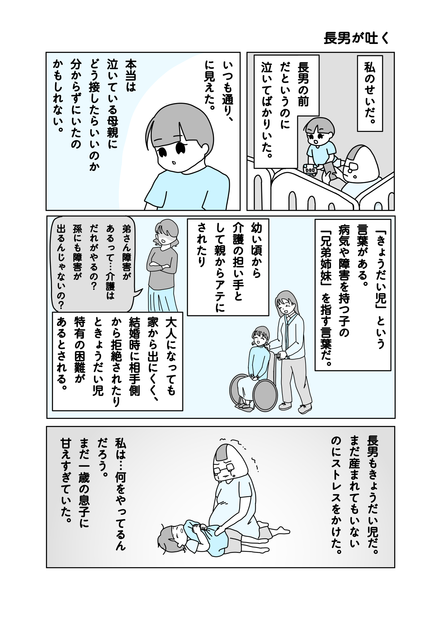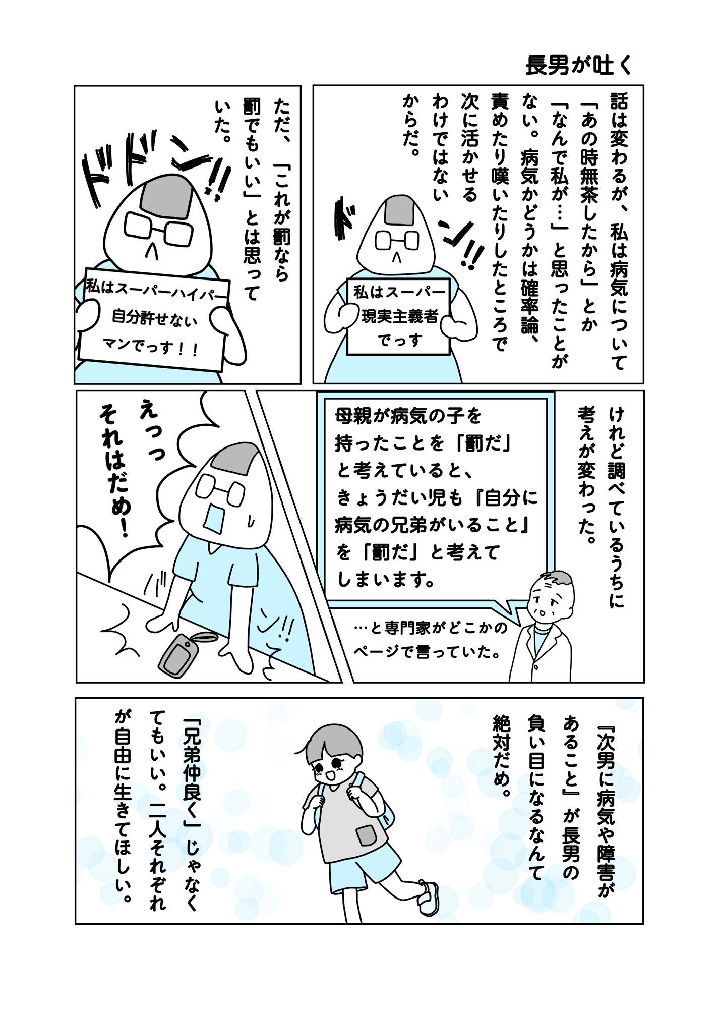 母親が病気の子を持ったことを「罰だ」と考えていると、きょうだい児も『自分に病気の兄弟がいること』を「罰だ」と考えてしまいます。