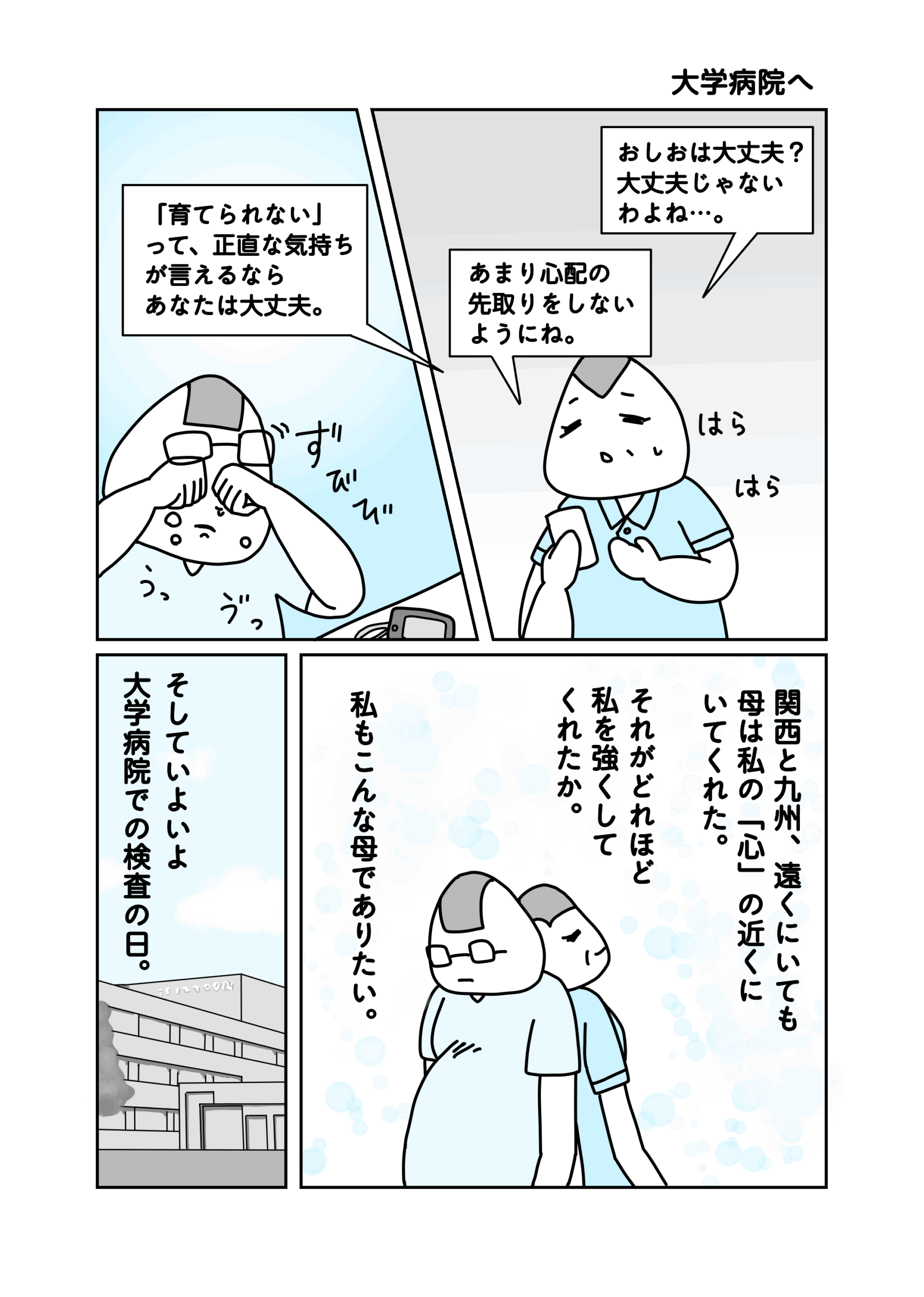 実母:おしおは大丈夫?大丈夫じゃないわよね…。あまり心配の先取りをしないようにね。「育てられない」って、正直な気持ちが言えるならあなたは大丈夫。